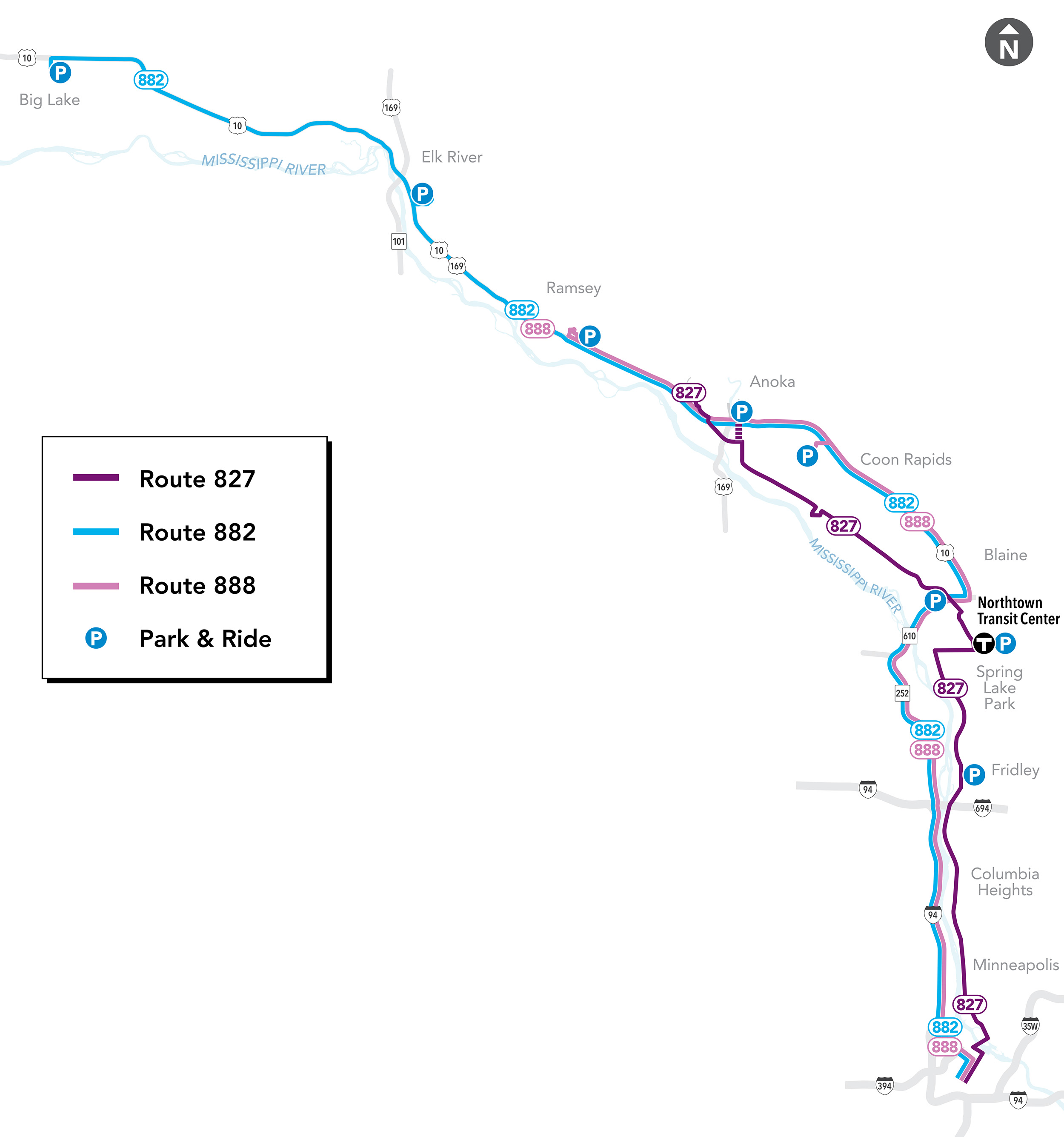 - Route 888 will serve existing Northstar stops in Ramsey, Anoka, Coon Rapids, and downtown Minneapolis. Route 888 will provide trips every 30 minutes arriving downtown during a.m. rush hours (6:30 - 8:30 a.m.) and leaving downtown in p.m. rush hours (3 – 5 p.m.). Additional hourly trips will serve reverse commutes and provide midday travel in each direction. Three southbound and three northbound trips will also be provided on Saturdays and Sundays.