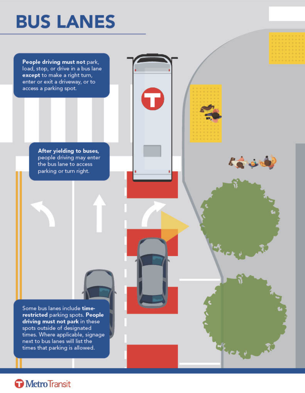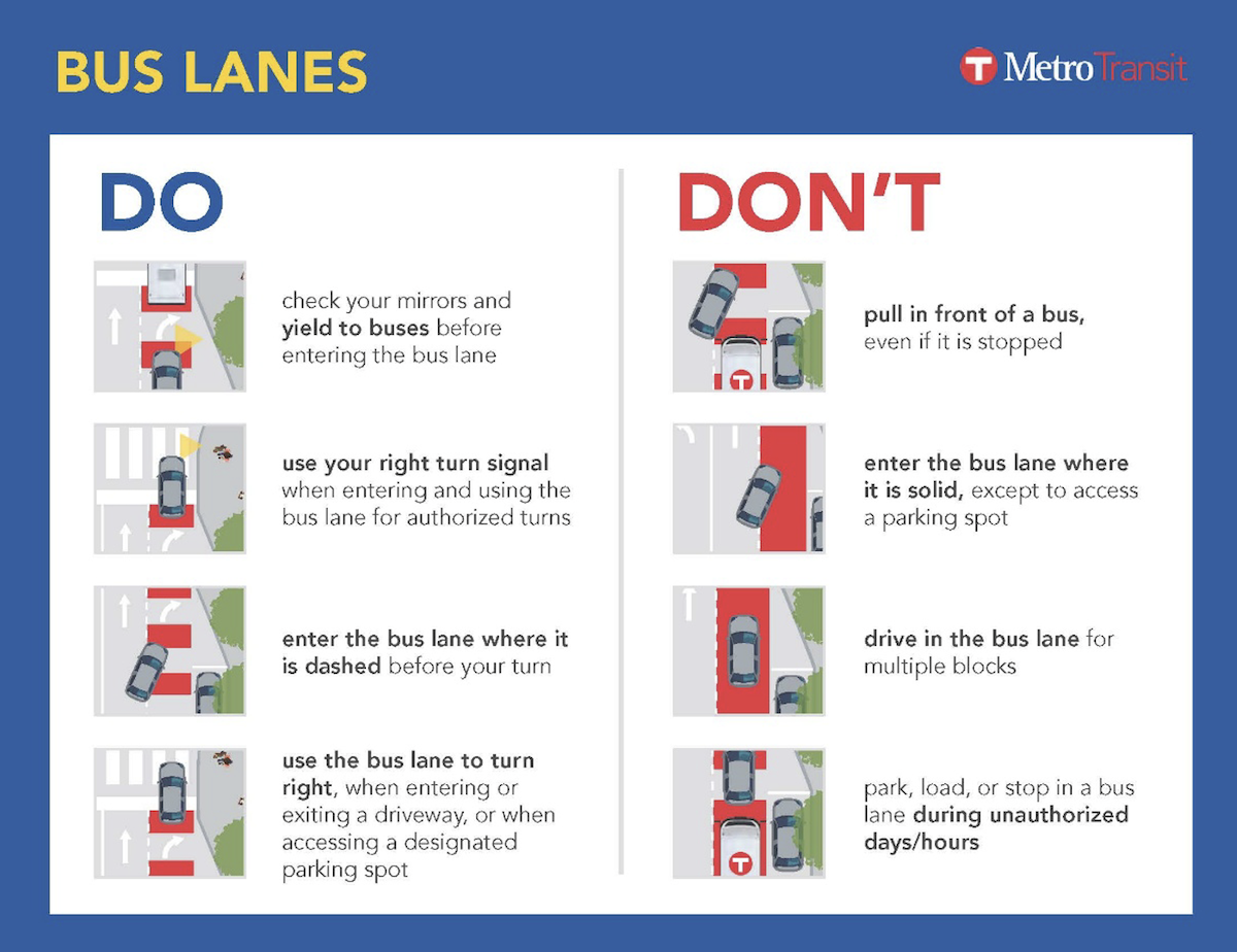 Bus lanes and transitways are generally created by adding new transit lanes, repurposing traffic lanes, or using parking lanes for transit use, either for part of the day or all day. Metro Transit works with roadway authorities (cities, counties, and MnDOT) to implement bus lanes based on a combination of factors, including transit volume and demand, the potential to reduce total person delay, and traffic patterns.