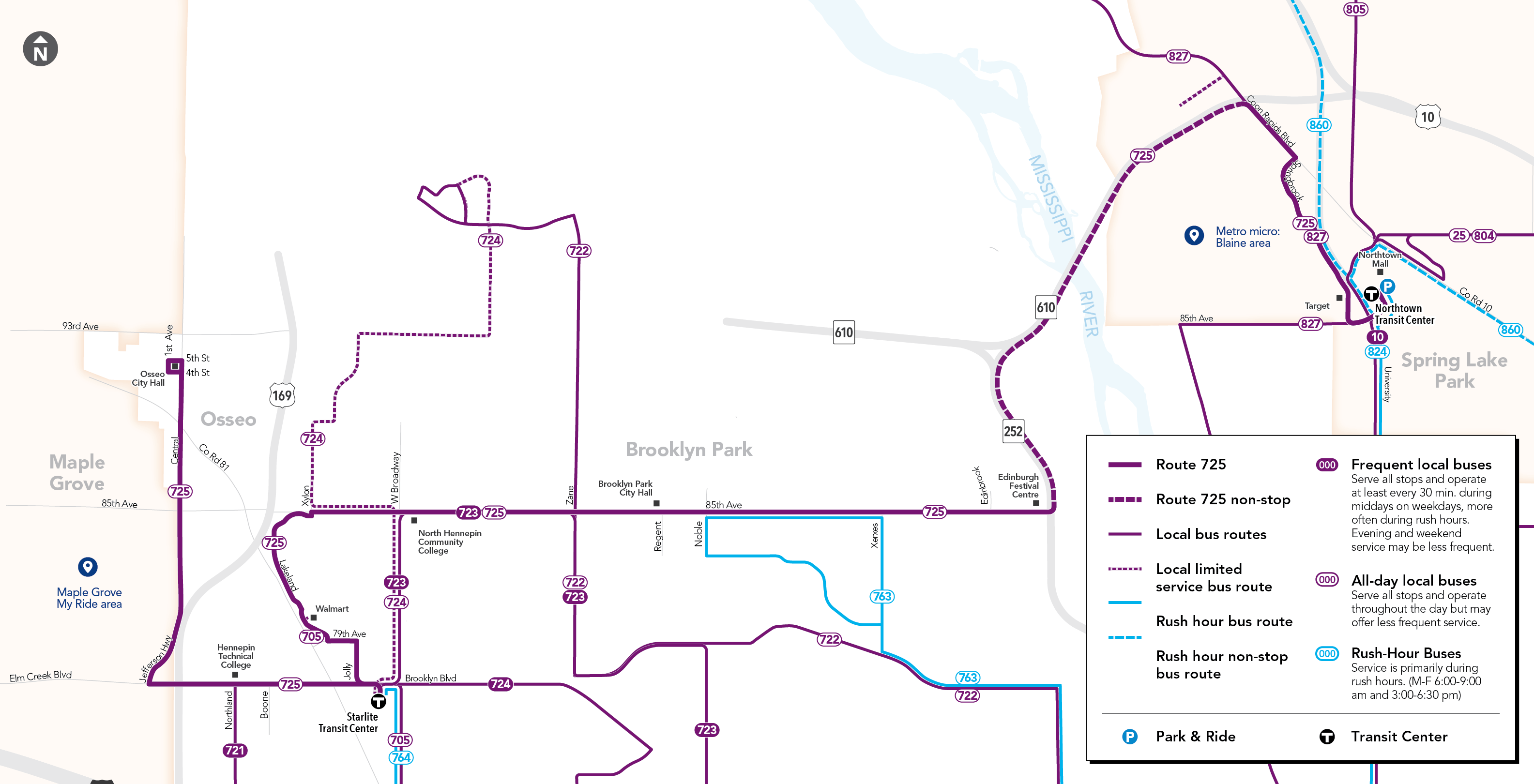 Route 725 began service on Dec. 6, 2025, connecting Osseo, Brooklyn Park, Coon Rapids, and Blaine. This travels along Jefferson Hwy., 85th Ave., and Hwy. 610 with hourly service from 6 a.m. – 10 p.m., seven days a week.