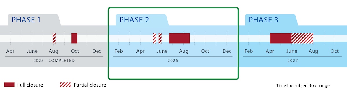 Phase 3 also includes major work in the Airport tunnel. This includes concrete work and full rail replacement.