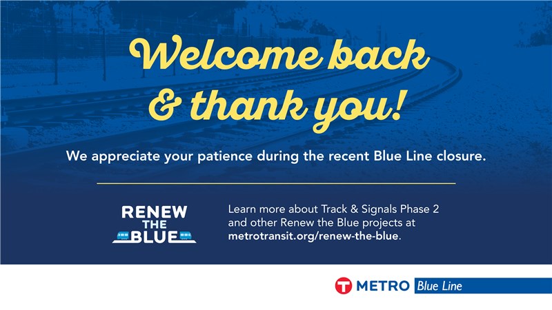 We’d love your feedback! Help us by taking a brief survey about your experience during the recent replacement bus service on the METRO Blue Line. Stay ahead of what is coming next year in Phase 2 and discover the scope of the full improvements coming to the METRO Blue Line corridor here. Renew the Blue will preserve and protect a critical piece of our infrastructure investment, helping it remain a safe, reliable, and affordable transit option for many years to come in the communities it serves!
